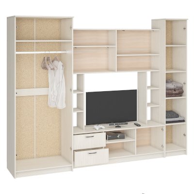 Комментарий: Долго искал гостиную под большой телевизор.Подошла только эта,с небольшой переделкой.Убрал боковые полки и поднял среднюю полку.В результате добился чего хотел.Очень доволен.