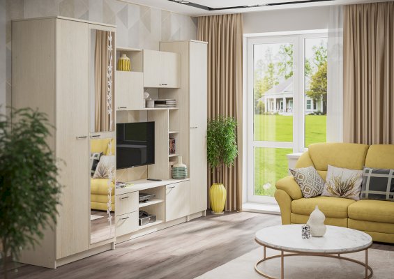 Многофункциональная и практичная гостиная выполнена в современном дизайне. Гостиная состоит из трёх модулей (шкаф платяной, шкаф бельевой, средняя секция)