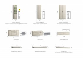 Фурнитура: Распашные двери на четырехшарнирных петлях. Горизонтальные откидные двери на газлифтах. Выдвижные ящики на шариковых направляющих.
