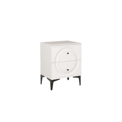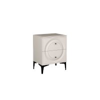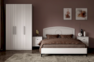 Основным декоративным элементом коллекции является круг. Явно представленный фрезеровкой по фасадам тумбы, комода, в изголовье кровати и ручках-кнопках.