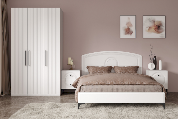 Фасады выполнены из МДФ с матовой ПВХ-плёнкой. Такое решение делает мебель визуально более "мягкой", комфортной и расслабляющей, что особенно актуально для спальни.