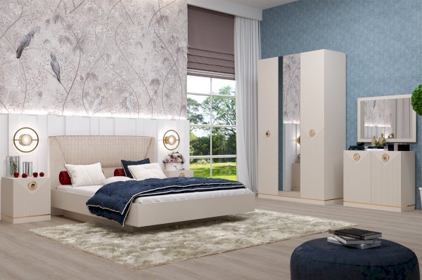 Мебель изготовлена из ЛДСП и МДФ в пленке ПВХ с очень популярной в последнее время матовой бархатистой поверхностью софт тач. Фасады имеют фрезеровку параллельными линиями, которая гармонично сочетается с эффектными яркими ручками в цвете глянцевое золото. Изделие имеет массивный цоколь , который визуально отделяют от корпуса золотая кромка.