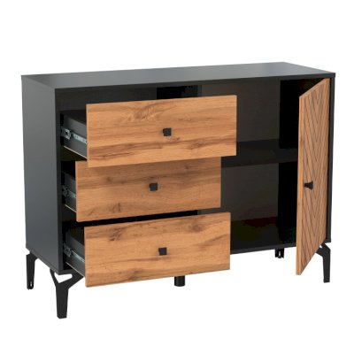 У комода три выдвижных ящика с шариковыми направляющими слева и отделение с распашной дверью на петлях без доводчиков справа. Внутри-полка, выполненная в цвет корпуса и выдерживает нагрузку до 5 кг.