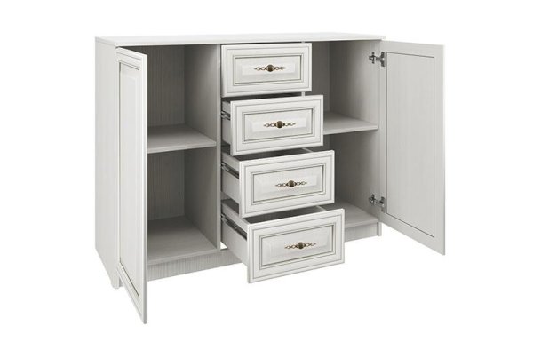 В комоде «Габриэлла» удачно сочетаются выдвижные ящики и две секции с полками из ЛДСП за глухими фасадами. Ящики оборудованы шариковыми направляющими. Полки выполнены в цвет корпуса. Каждая полка выдерживает нагрузку до 5 кг.
