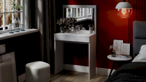 Несмотря на свои компактные размеры, туалетный стол имеет функциональный ящик с шариковыми направляющими для хранения парфюмерии, украшений и многого другого, достаточно вместительную столешницу, где можно разместить все необходимые аксессуары и полноценное зеркало. В этом туалетном столике нет ничего лишнего, только самое необходимое для уголка женской красоты.