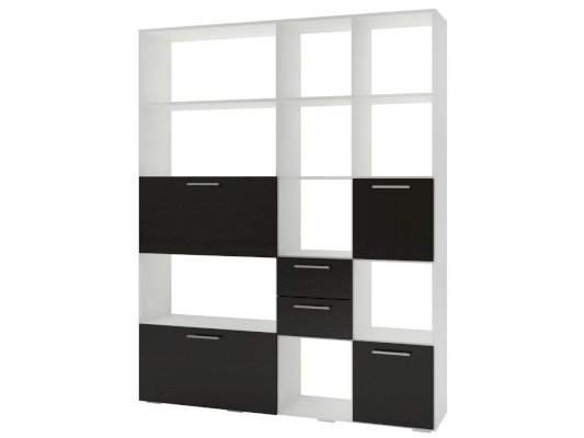 Применение задней стенки из ЛДСП (в ячейках с ящиками и фасадами) позволяет использовать данный стеллаж для зонирования пространства (чтобы предотвратить опрокидывание, необходимо обеспечить крепление стеллажа к стене).