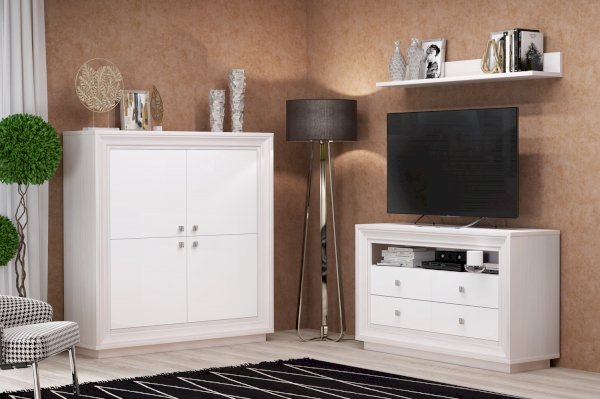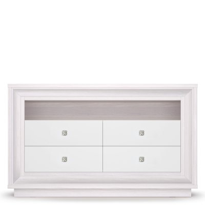 Жемчужные фасады и декоративный багет выполнены из МДФ в пленке ПВХ с легким сатиновым эффектом. Такой нарядные декор подчеркивает принадлежность мебели к стилю Ар-деко и служит украшением мебели и вашего интерьера. В дополнении к образу элегантной респектабельной модели ТВ-тумбы предусмотрены изысканные ручки цвета «венецианское серебро» с растительным рисунком.