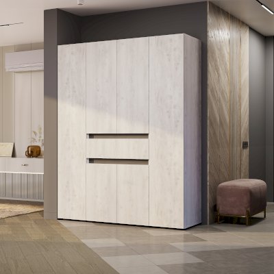 Четырехстворчатый шкаф «Мрия» – это настоящая находка для семьи, а также для обладателей большой коллекции одежды. Два крайних отсека идеально подойдут для хранения верхней одежды, костюмов и рубашек. Центральная секция с полками и ящиком - для постельного и нижнего белья, также здесь можно хранить обувь.